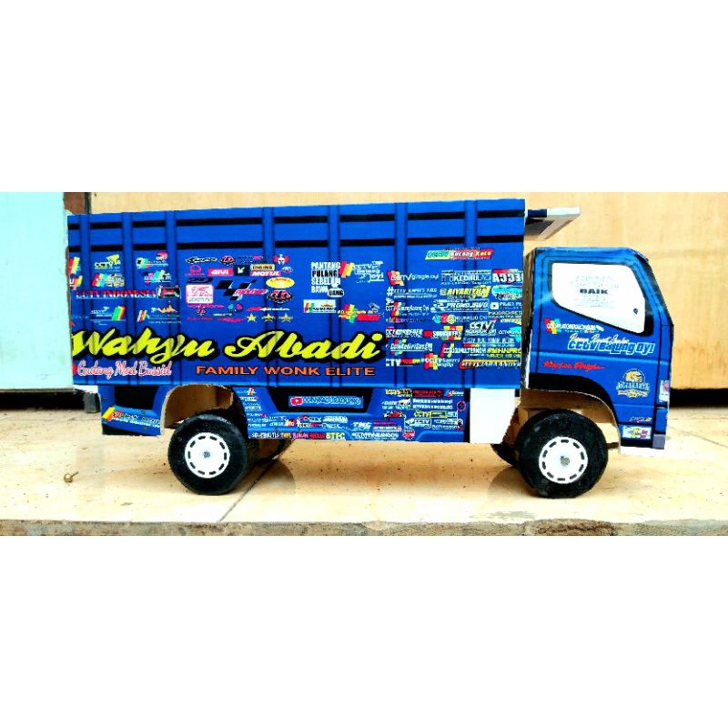 Di jual miniatur truk canter murah meriah, spek full kayu, kabin jungkit, pintu bak bisa dibuka dll.